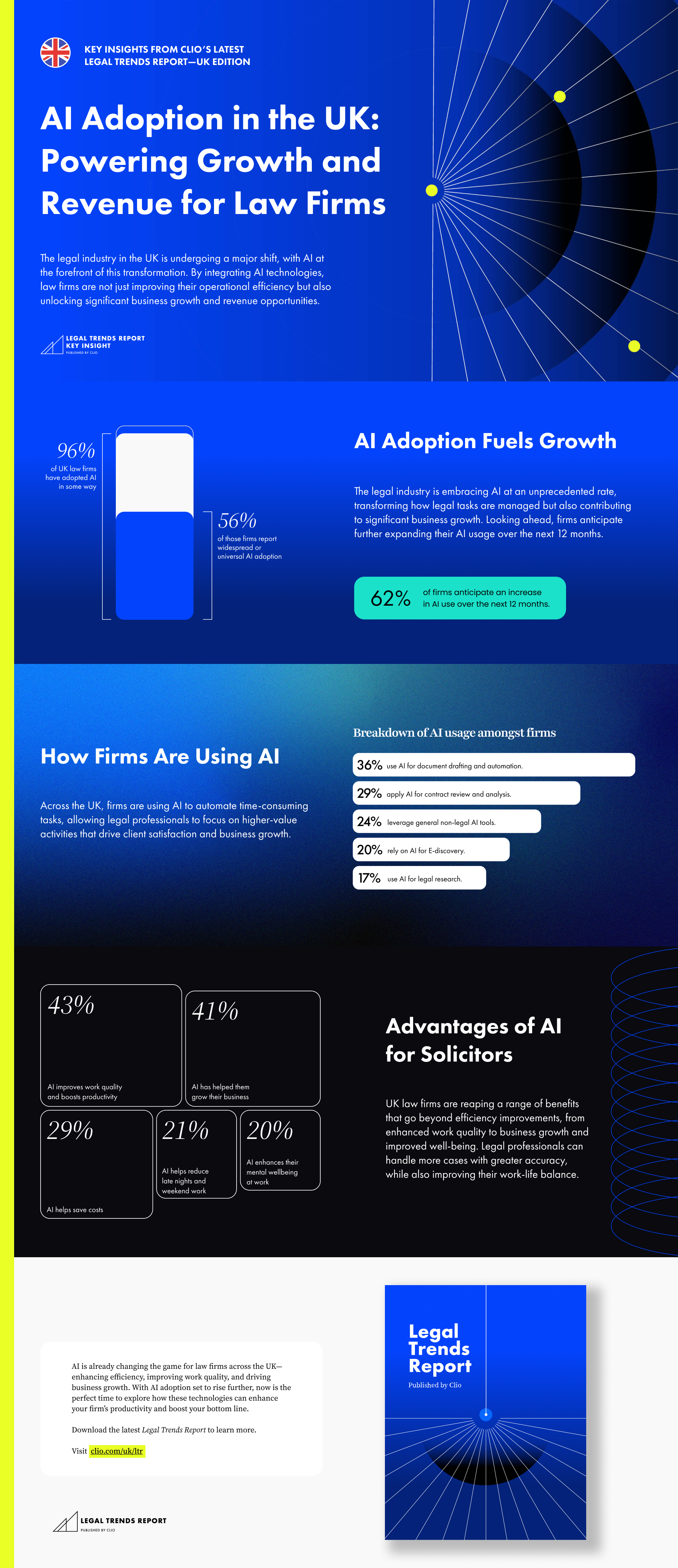 AI has moved from an emerging technology to a core part of many law firms’ operations. According to Clio’s findings, AI is currently used by 96% of UK law firms, with nearly two-thirds (62%) of solicitors expecting to increase its use further in the coming year. Law firms are using AI to automate routine tasks, improving work quality and productivity while enabling lawyers to focus on client engagement and growth-driving activities.